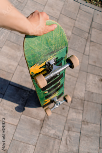 Close-up of a skateboard that a skateboarder holds in his hand in a public park the concept of adrenaline craving and the love of skateboarding