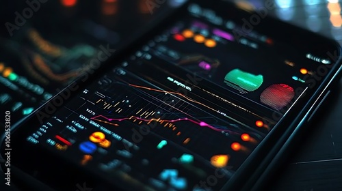 smartphone, display, screen, datum, chart, financial, graph, line, number, statistic, trading, investment, market, business, technology, digital, mobile, app, interface, detail, colourful, glowing, dark, background, modern, future, progress, growth, economy, analysis, research, trend