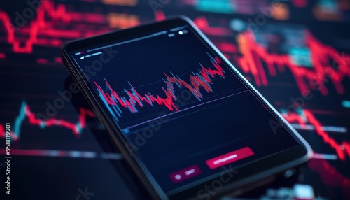 Close-up of a smartphone displaying stock market data with red and blue graphs, representing trading and financial analysis.