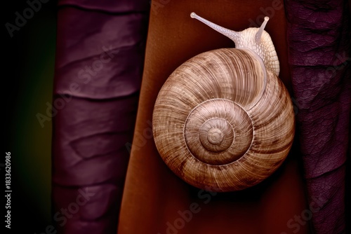 Close-Up of a Snail Shell on a Dark Background with Abstract Texture Elements