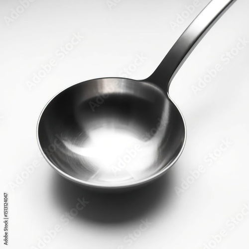 Close-up of a stainless steel ladle, bowl-shaped, smooth surface, reflecting light