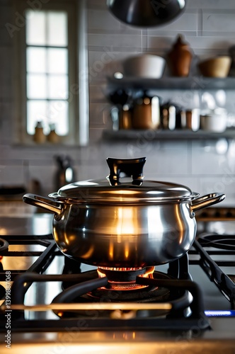 Close-up of a stainless steel pot boiling on a modern gas stove with a bright blue flame, warm kitchen background blurred,Generative Ai