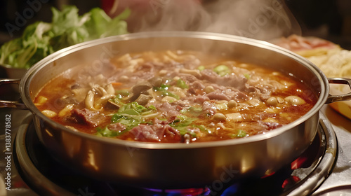 hot pot, simmering, cooking, food, cookery, asian cuisine, chinese food, korean food, beef, mushroom, greener, vegetable, broth, soup, dining, meal, flames, heat, steam, savoury, delicious, traditional, dish