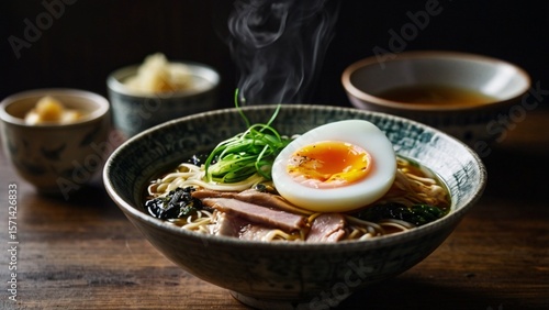 Close-up of a steaming hot ramen bowl with rich broth, soft-boiled egg, sliced pork, seaweed, and green onions. Moody background with shallow depth of field and dramatic lighting to emphasize texture.