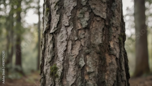 Close-up of a tree trunk's bark, textured with grooves and moss. Forest in soft focus background