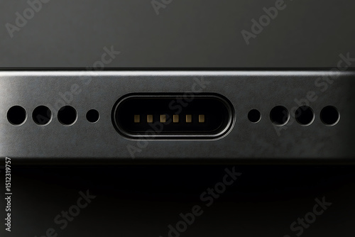 smartphone, port, connector, charging, speaker, grille, audio, sound, technology, device, contraption, electronic, mobile, phone, dark, grey, metal, closeup, macro, detail, texture, design, modern, sleek, minimalist, interface, connection, power, input, output, hardware, component, digital, innovation, precision, engineering, industrial, product, background, metallic