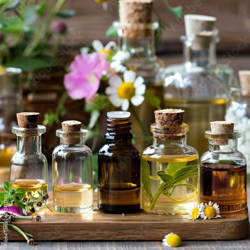 Close-up of a variety of essential oils next to their source plants, focusing on natural healing and aromatherapy Job ID: 1a15e76d-86bb-46f5-b770-fa4942bfb1e7