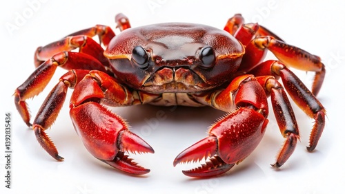 Closeup of a Vibrant Red Crab with Bold Black Claws on a Pristine White Background A Macro Photography