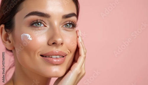 Close-up of a woman applying cream to her radiant, smooth face. Skincare routine promotes youthful glow, confidence, and healthy skin. Cosmetic application in a professional beauty setting.