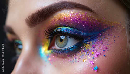 Close-up of a woman's eye with artistic makeup featuring vibrant colors and glitter