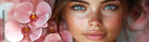 Closeup of a womans face with pink orchids, soft lighting, dreamy atmosphere