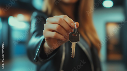 Closeup of a womans hand presenting a key. Shes wearing a black leather jacket. The background is blurry, suggesting an indoor space. The image conveys a sense of new ownership or access.