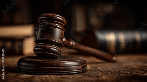 Close-up of a wooden law hammer or gavel on a judge's desk with blurred law books in the dark background, symbolizing justice and authority.