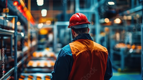 Close-up of a worker standing at the production line, back turned, checking stock on shelves, industrial atmosphere with vibrant lighting and sharp focus