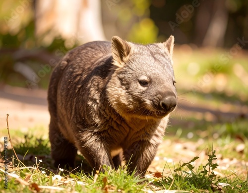 wombat, young, walking, wildlife, animal, nature, australia, marsupial, mammal, cute, closeup, outdoors, grass, ground, fur, brown, grey, fauna, portrait, exterior, forested, sunny, light, shadow, sharpened, shallow, depth, small, adorable, endemic, native, inland, bush, path, trail, environment, conservation, protected, photo, wild