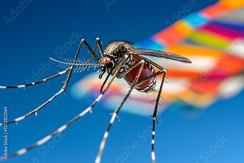 Close-up of Aedes aegypti on a vibrant kite flying against a clear blue sky, freedom theme.