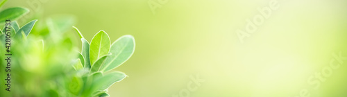 Closeup of beautiful nature view green leaf on blurred greenery background in garden with copy space using as background cover page concept.