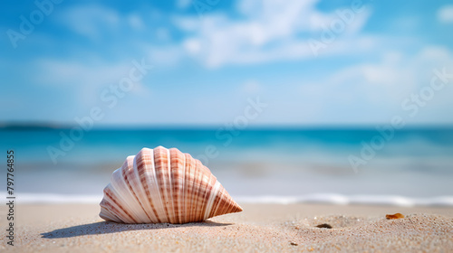 beach, shell, closeup, blue skies, ocean, summer getaway, nature, sand, calmness, advertising, product, business, shooting, e-business, publicity, marketing, promotion, empty, poster, art, copy space, photo, background, illustration, theme