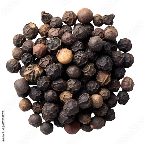 Close-up of Black Pepper: A high-angle, close-up shot showcases a pile of whole black peppercorns, highlighting their texture and color, bringing out the essence of an everyday culinary spice.