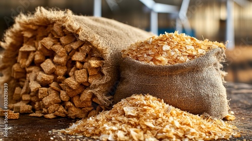 Close-up of burlap sacks containing wood chips and shavings, used for biomass fuel or industrial purposes, on a rustic surface.