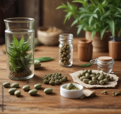 Close-up of cannabis beakers and hemp pills on wooden table, science lab, pharmaceutical