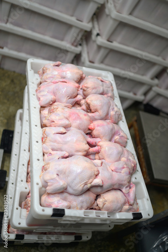 crate, poultry, hygiene, safety, organisation, preparation, quality control, freshness, warehouse, closeup, chicken, stacked, storage, refrigeration, logistic, sanitation, chilled, industrial, production, food, meat, market, fresh, raw, squid, seafood, fish, animal, butcher, pork meat, octopus, sea