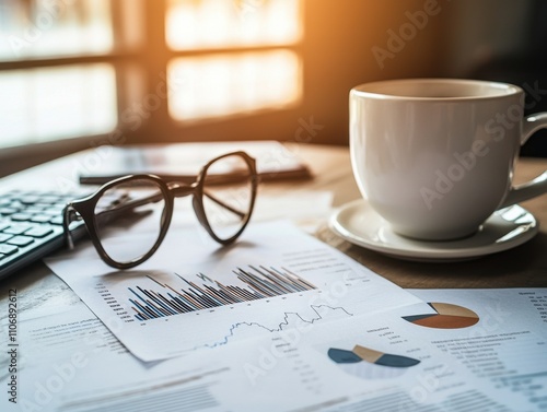 hot drink, document, desk, close, glasses, financial, report, business, graph, work, sharpened, notebook, computer, ledger, plan, contract, paperwork, morning, laptop, inspecting, finance, revenue, workflow, spreadsheet, paper, planner, espresso, profit, office, expense, budget, design, client, income, workspace, receipt, meeting, review, datum, caffeine