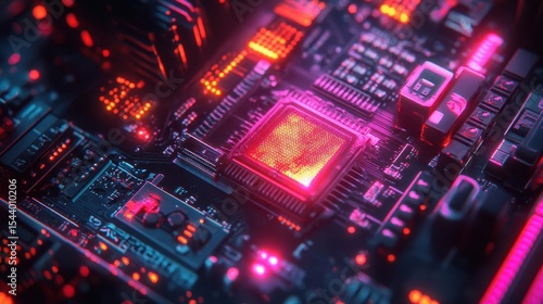 Closeup of cryptocurrency mining rig, intricate details, dark background, neon highlights, macro shot