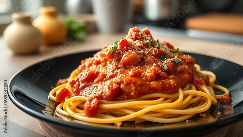 Close-up of delicious spaghetti with rich tomato sauce, steam rising from the plate.