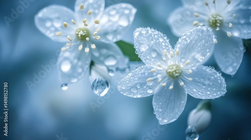 Close-Up of Dewy White Flowers with Soft Blue Background