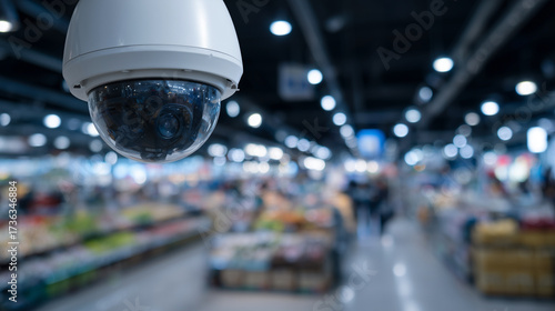 Close-up of dome security camera reflecting light, positioned above retail aisle, blurred shoppers and colorful merchandise creating depth in background