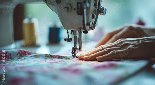 hand, sewing, machine, fabric, vintage, elderly, closeup, operating, floral, pattern, stitching, thread, needle, sharpened, detail, craft, textile, delicate, precise, movement, work, artistry, skilful, aged, light, soft, warm, retro, design, texture, close, skilled, motion, craftsmanship, art, home