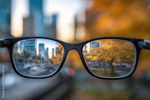 Closeup of Eyeglasses Reflecting Urban Buildings and Autumnal Trees Scenery