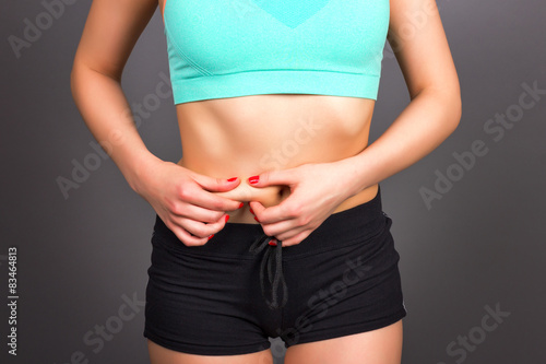 Closeup of fit young woman checking her belly fat, concept for