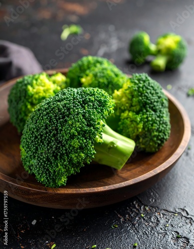 Close-up of fresh broccoli florets arranged on a wooden plate with dark, textured background
