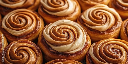 Close-up of freshly baked cinnamon rolls with cream cheese frosting