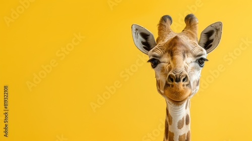 giraffe, animal, wildlife, close, up, portrait, nature, yellow, background, mammal, long, neck, safari, zoo, exotic, wild, herbivore, tall, savanna, africa, spot, gentle, browsing, fauna, big, eye, leg, pattern, camouflage, jungle, horn, biology, species, conservation, ecosystem, environment, landscape, photo, wilderness, outdoors, travel, beauty, elegance, unique, posture, serene, copy space