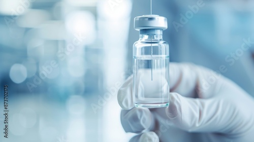 Close-up of gloved hand holding a vial with a needle. Medical research, healthcare, and vaccination concept with a blue background.