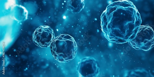 Close-up of glowing cells in a blue environment, ideal for medical, scientific, or biotechnology content related to cellular research, microbiology, or health sciences