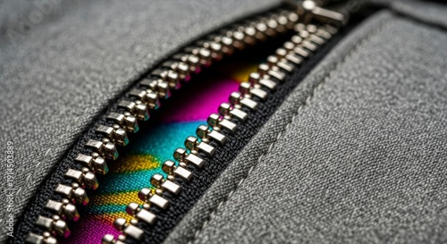 zip, fabric, grey, colourful, closeup, textile, clothing, detail, fashion, accessory, material, seam, stitching, thread, needle, craft, manufacturing, industry, apparel, garment, style, design, vibrant, colours, rainbow, many-coloured, iridescent, shimmer, shine, metallic, teeth, slider, pull, fastener, closure, sewing, tailoring, outfit, attire, wearable, fashionable, trendy, modern, contemporary, stylish, glamourous, luxury, high-end, quality