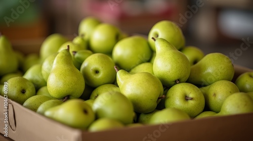 pear, fruit, green, box, fresh, produce, grocery, market, store, organic, healthy, ripe, juicy, sweet, delicious, crisp, vitamin, antioxidant, fiber, snack, dessert, breakfast, lunch, dinner, vegetarian, vegan, natural, seasonal, agriculture, farm, harvest, fruit farm