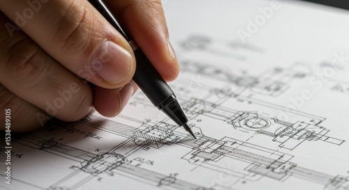 Close-up of hand drawing intricate engineering schematic with precision pen on paper