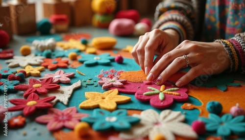 Close-up of hands crafting colorful felt flower decorations on a vibrant crafting table during a DIY session