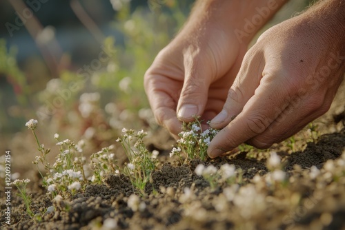 gardening, planting, flower, white flower, dirtied, hand, closeup, nature, spring, summer, horticulture, agriculture, botany, earth, ground, farm, field, sunlight, sunset, blossom, bloom, growth, cultivation, springtime, delicate, detail, rural, countryside, ecosystem, environmentally friendly