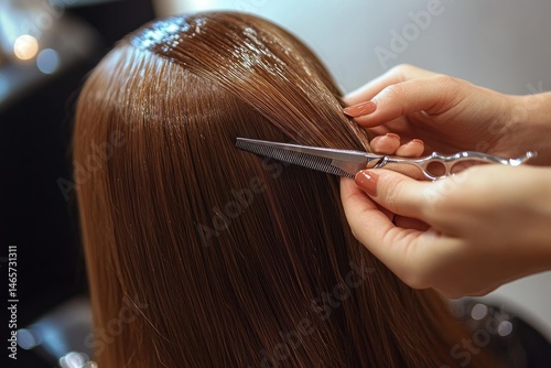 Close-up of hands holding comb and thinning scissors while trimming straight brown hair in a salon setting