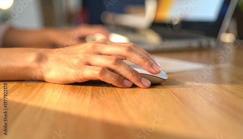 Close-up of hands operating a computer mouse on a wooden desk, laptop in background, depicting modern digital work, online navigation, and focused productivity