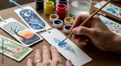 Close-up of hands painting colorful tarot cards on a wooden table with art supplies.
