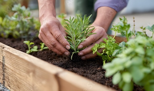 Close-up of hands planting herbs in small urban garden, eco-friendly lifestyle