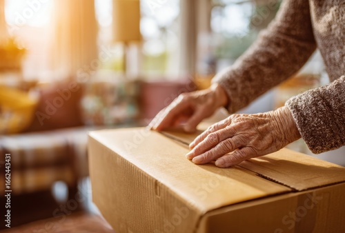 Close-up of hands sealing a cardboard box in a well-lit indoor setting