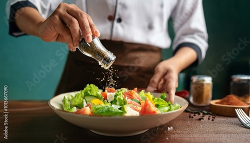 Close-up of hands seasoning a salad with pepper, highlighting the importance of fresh ingredients and personal touches in cooking.